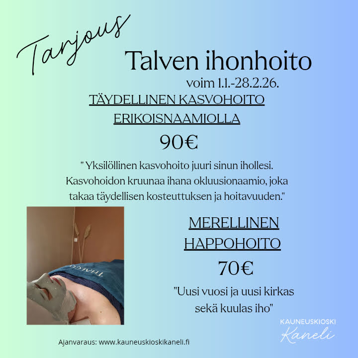 Tervetuloa rentoutumaan kauppakeskus Länsi 1:ssä. Kauneuskioski kaneli on Länsikeskuksessa sijaitseva kauneushoitola. ”Kioski” ei tarkoita pelkästään nopeutta, vaan myös mutkattomuutta ja iloa! Haluamme tarjota ripauksen hyvää oloa ja eleganssia.